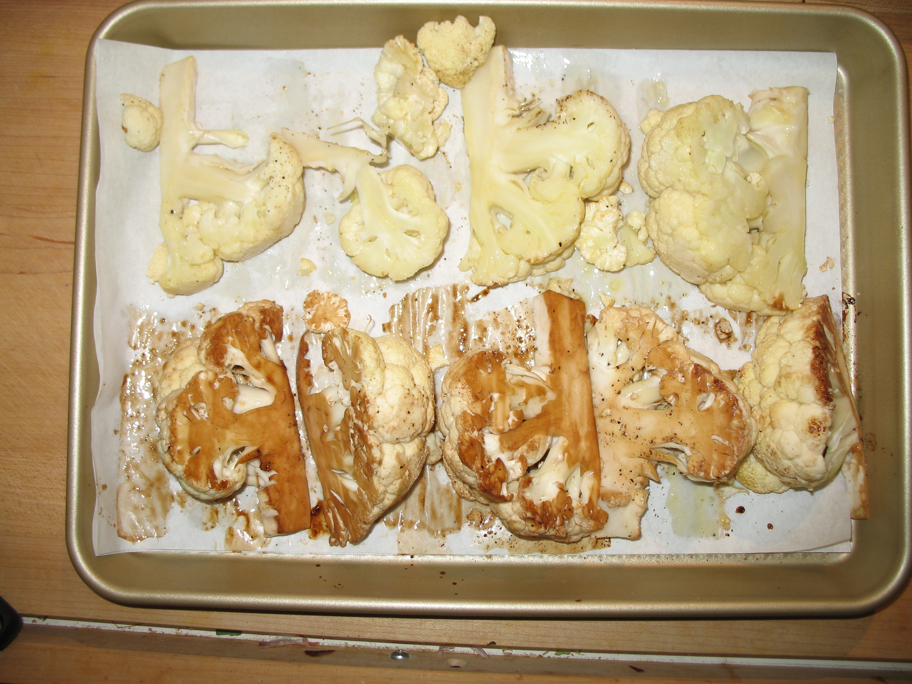 Remove leaves from base of cauliflower. Cut the cauliflower so that the stem can be used as a ‘handle’ for each piece. Place the pieces on a pan for the oven, convection or toaster oven. Drizzle the olive oil and balsamic over the cauliflower and then salt and pepper to taste. Flip over to distribute on both sides.