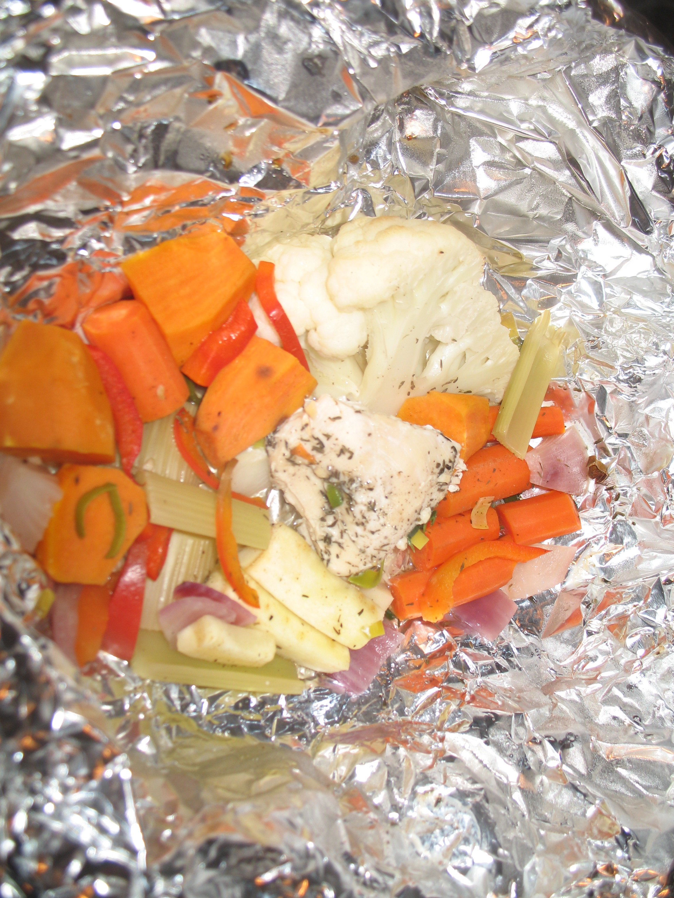 Cut a piece of heavy duty aluminum foil about 18 inches long. Place the meat in the center of the foil. Surround the meat with the vegetables in one layer. Bring the long ends of the foil together and fold down in 1 inch folds until formed around the meal. Fold the remaining ends up and crimp forming around the meal. Put in a medium fire until done or in a preheated 350°F oven for about 35-45 minutes. Be very careful when opening packet as the steam will blast out – OPEN VERY SLOWLY! Eat right out of the packet supported by a plate. Serve with a piece of toasted bread for soaking up the great juices!